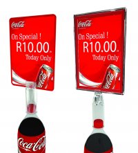 Injection moulded plastic display header cards that can be mounted onto bottles.